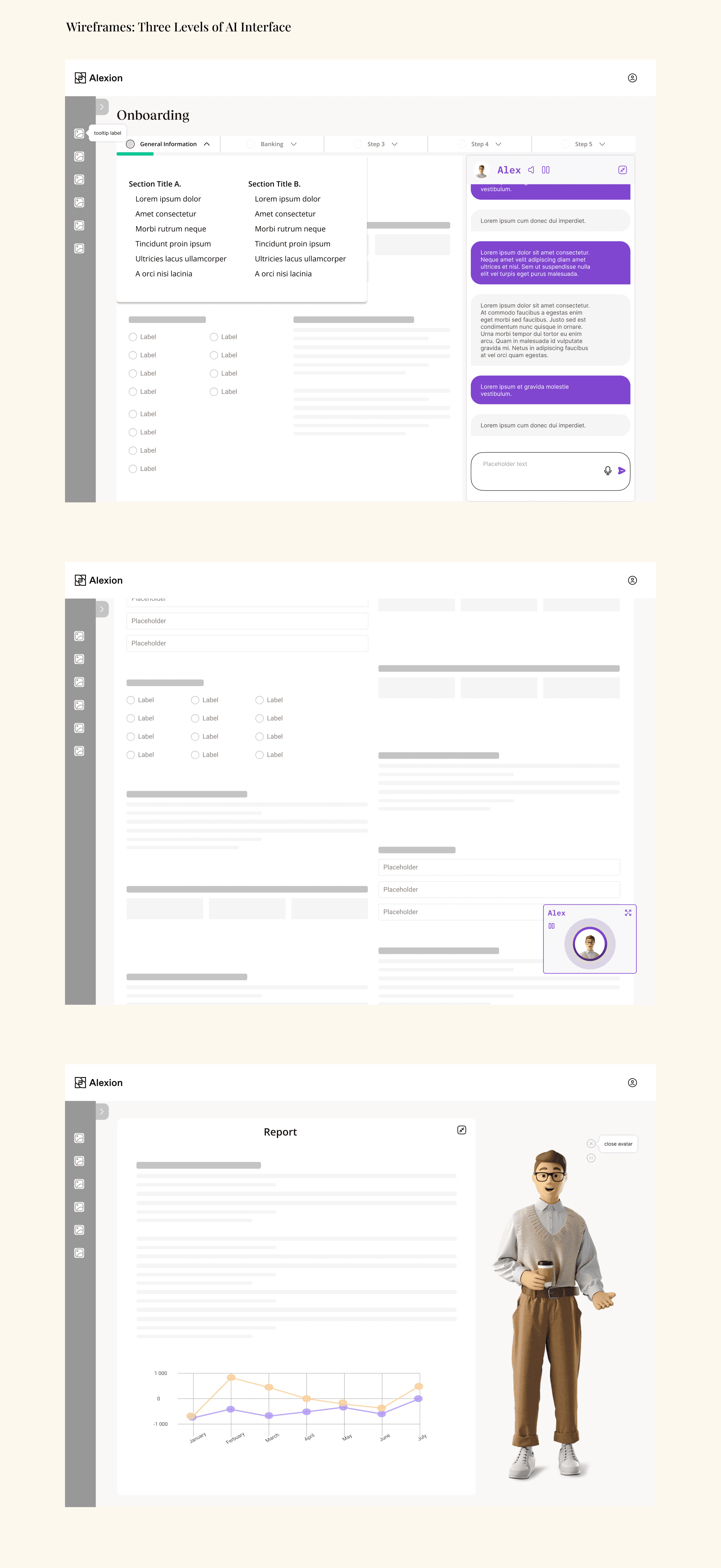 Using low/ medium fidelity UX wireframes to explore with leadership the possibility of allowing users to choose from three different levels of AI interface; as assistant, as invisible software, and as friendly personality.
