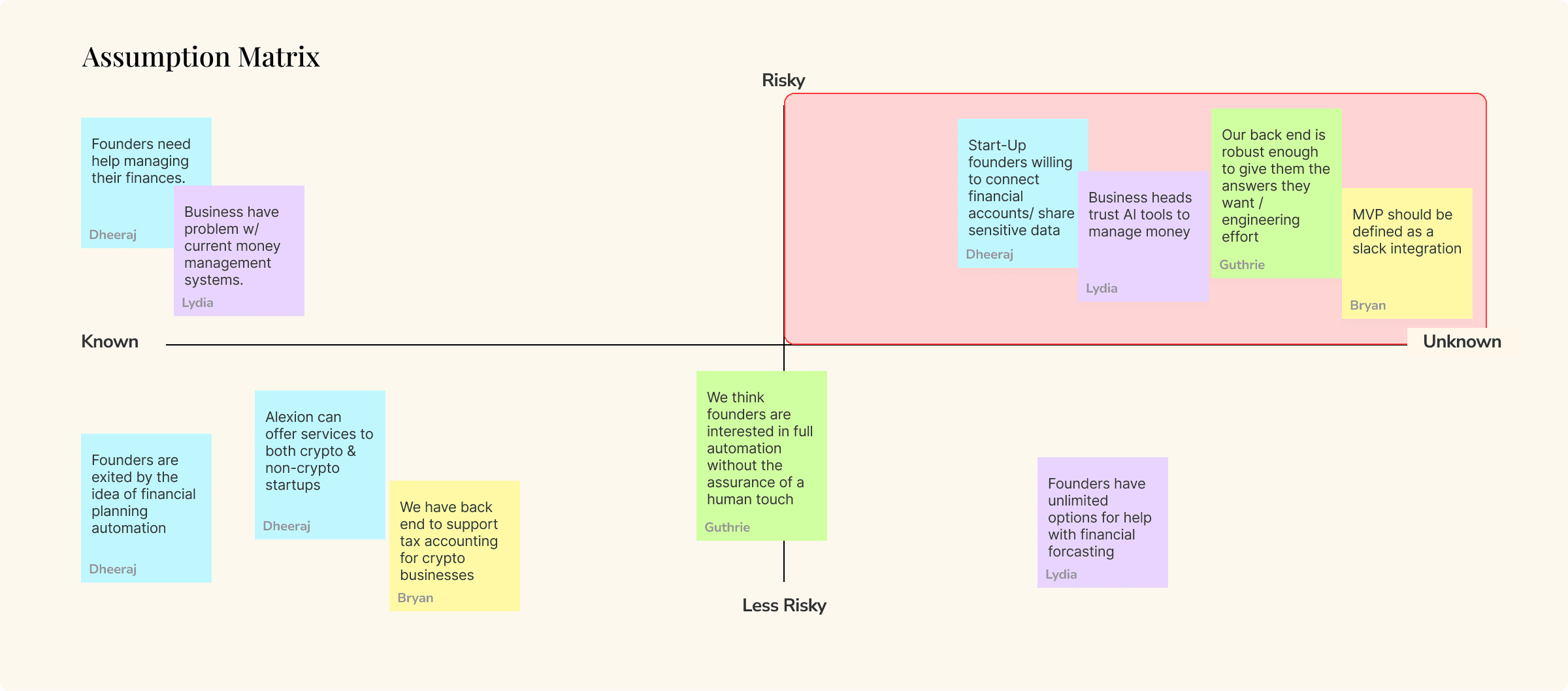 Led a cross-functional assumptions matrix workshop with product, engineering, and leadership teams to identify areas of highest risk.